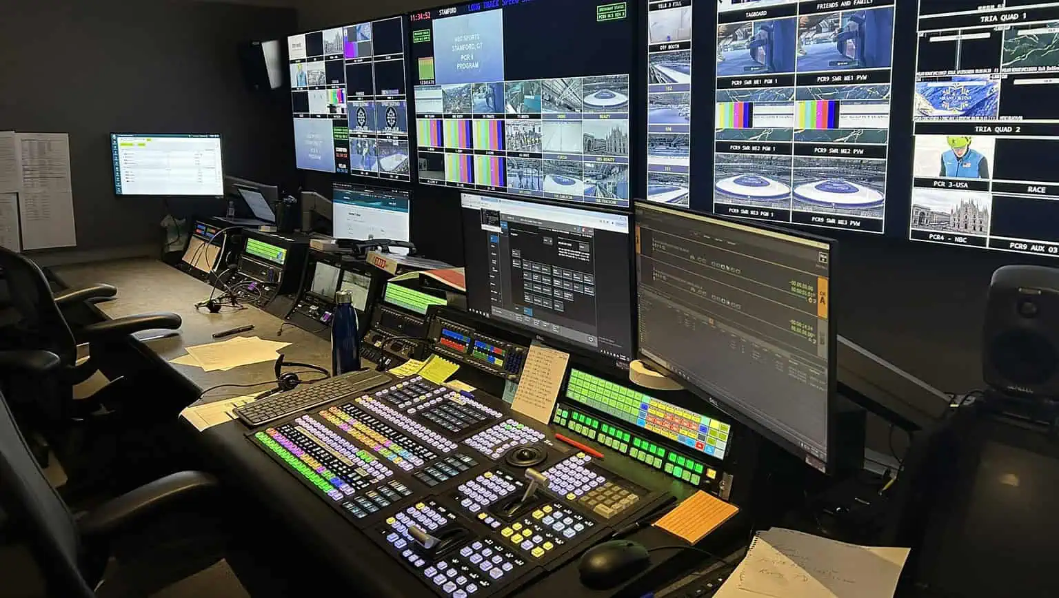 Between Paris 2024 and Milan Cortina 2026, NBC built four “micro control rooms” (PCRs 9, 10, 12, and 13) primarily to serve its Big Ten college-basketball package. The identical PCRs have a smaller footprint than traditional control rooms and offer streamlined workflow for high-volume properties, like college hoops. They are built around Sony MLS-X1 switchers with 64 routable inputs and Calrec Argo 24-channel audio consoles (recently upgraded from Calrec Brio) and are typically paired with two EVS replay systems.